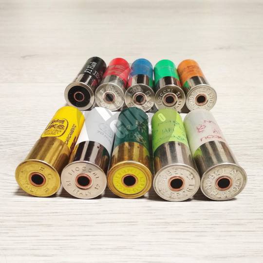 Есть фальшпатроны красного, синего, золотого, черного цвета, а также полупрозрачные - белые, зелёные, бордовые. Есть возможность комплектовать новыми гильзами - красными, зелёными и полупрозрачными, но с доплатой за новую гильзу 3 грн. Также возможна комплектация дробью от 24гр. до 32 гр. и пулей Lyman 30 гр. (за пулю доплата 4 грн.)