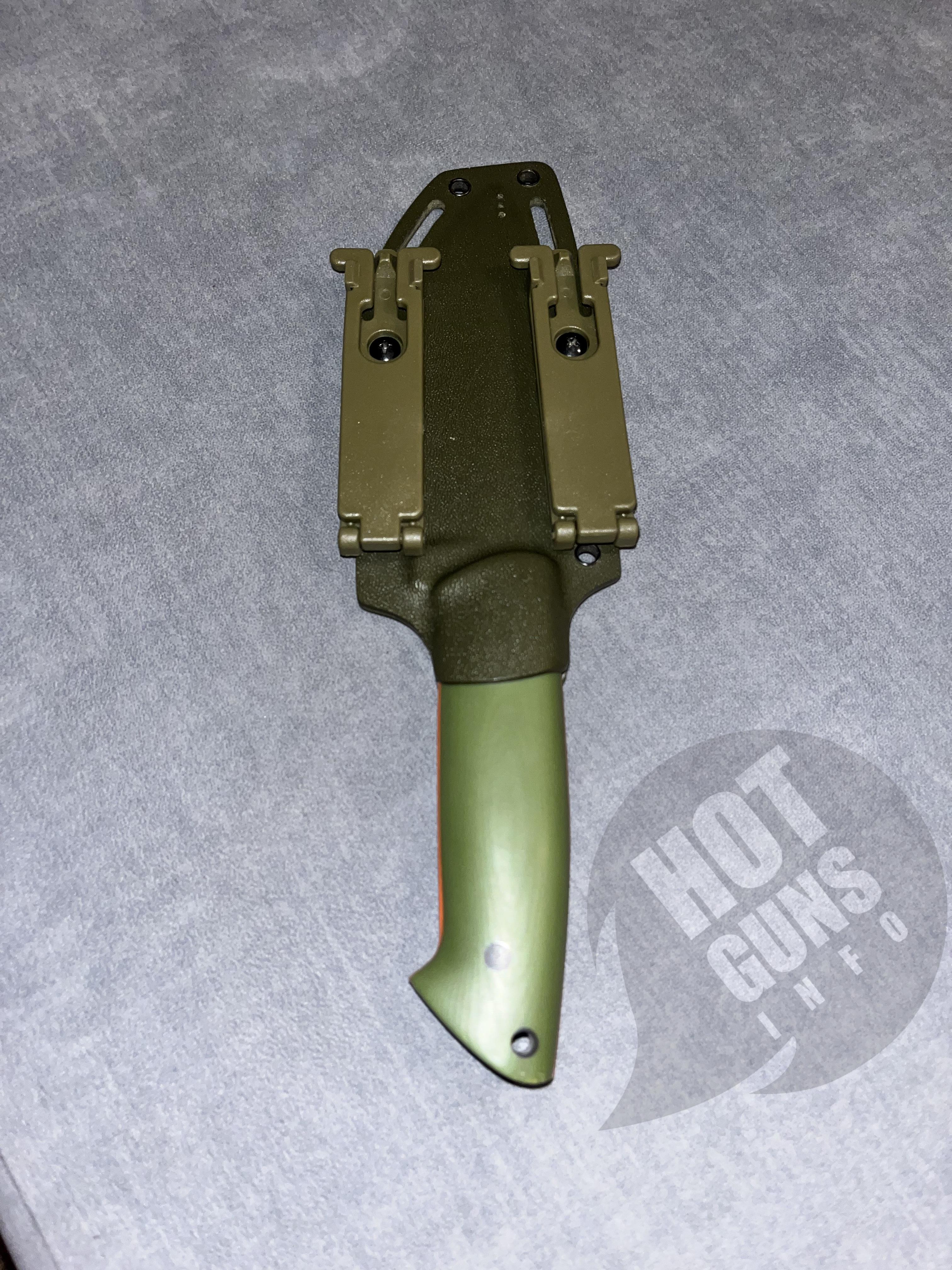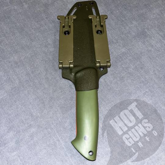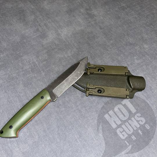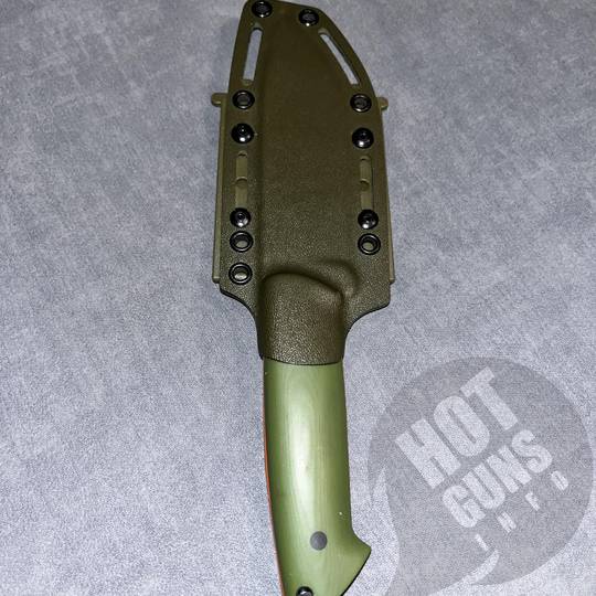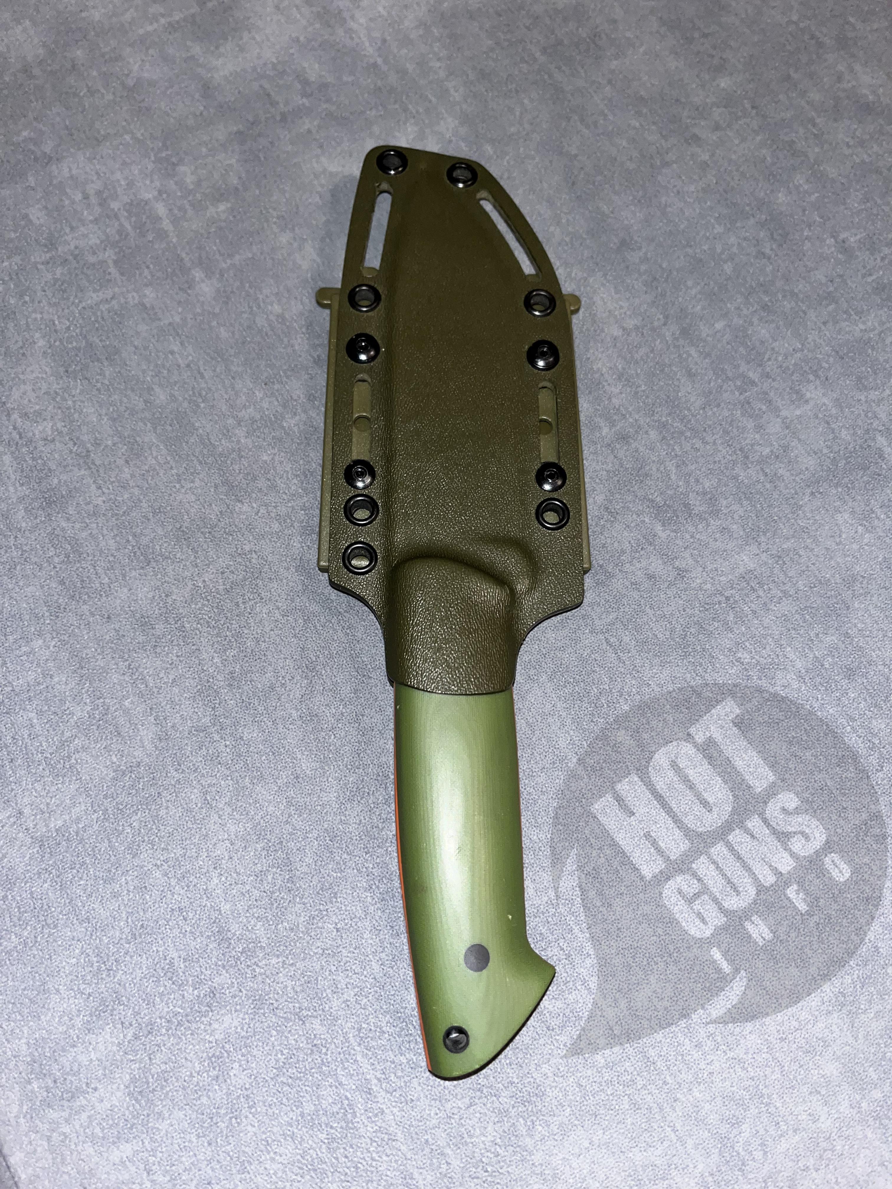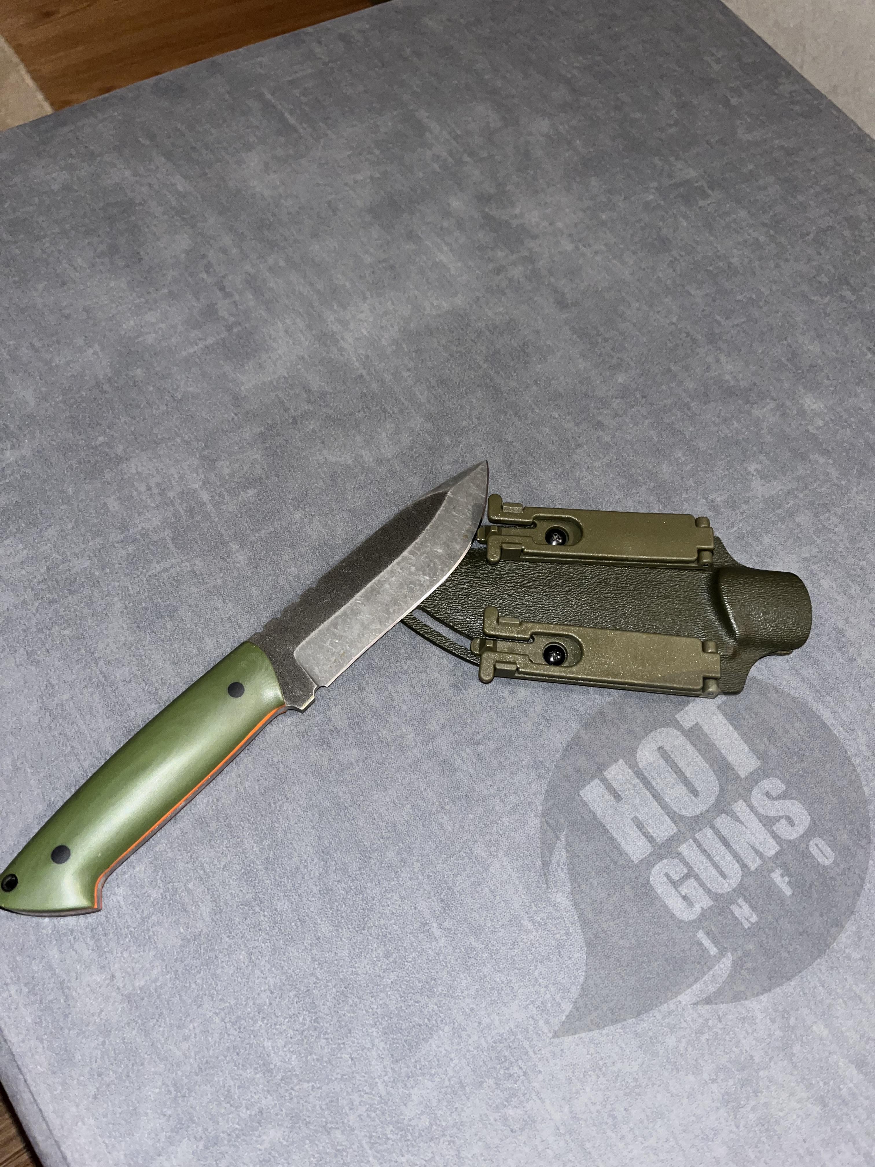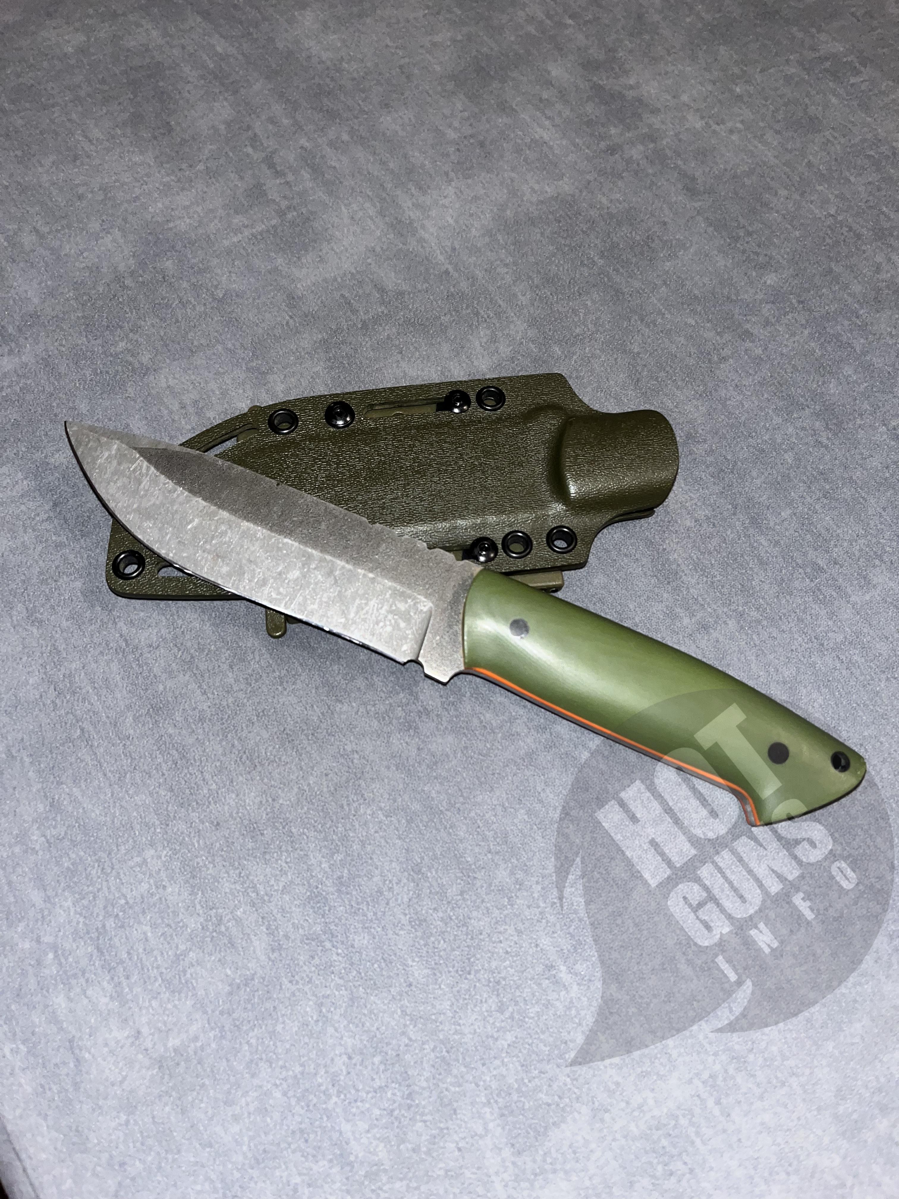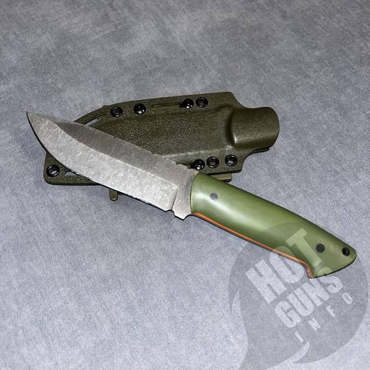 Ніж ручної роботи,сталь N 690,накладки з мікарди з помаранчевими вставками.Піхви з кріпленням на пояс.Розміри:загальна довжина 26 см; довжина ручки 12,8 см;товщина клинка 4 мм.