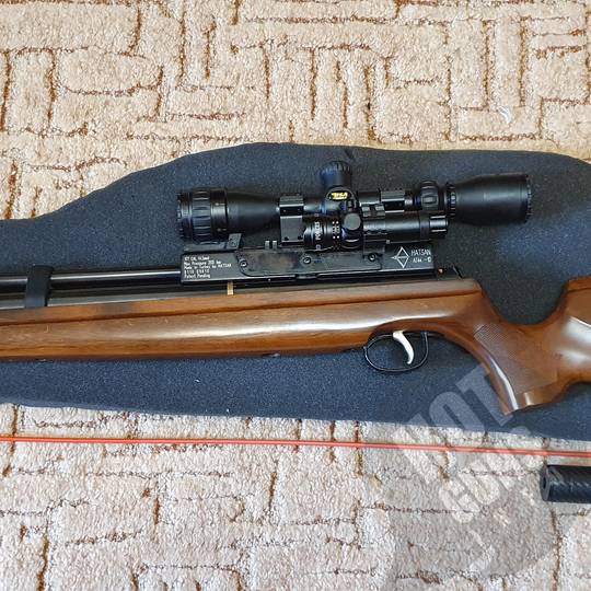 Пневматическая многозарядная винтовка. Начальная скорость пули составляет 325 м/c. Оборудована оптическим и лазерным прицельными приспособлениями. В комплекте: насос ВД, шомпол, глушитель и чехол. Возможен торг, в разумных пределах.