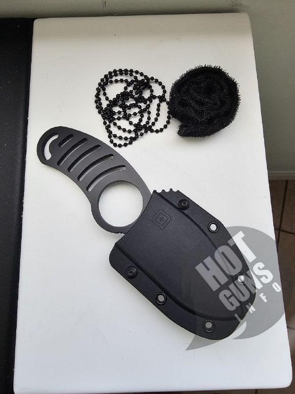 Ніж покритий матово-чорною фарбою і має каркасну рукоять.
