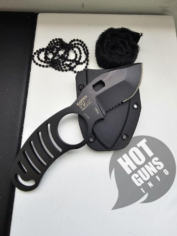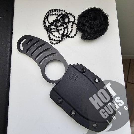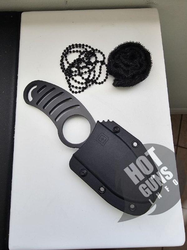 Ніж покритий матово-чорною фарбою і має каркасну рукоять.