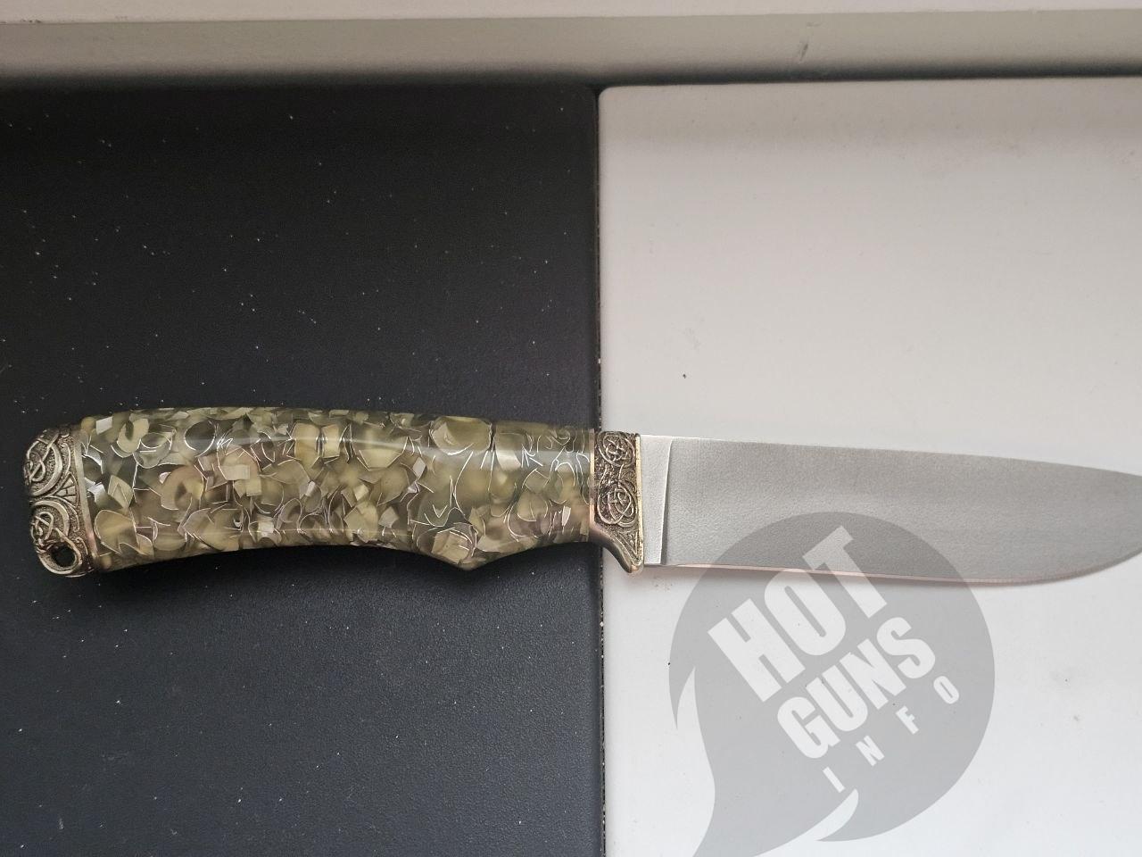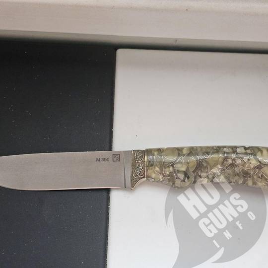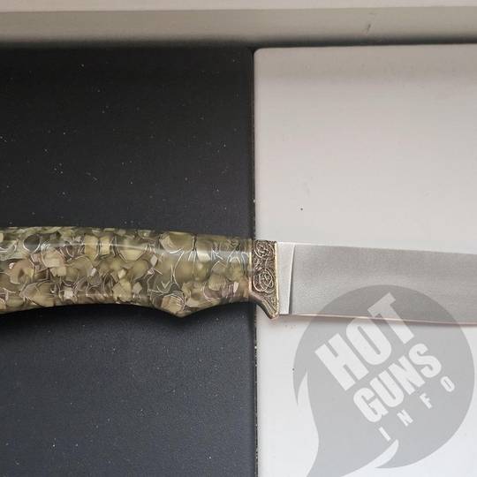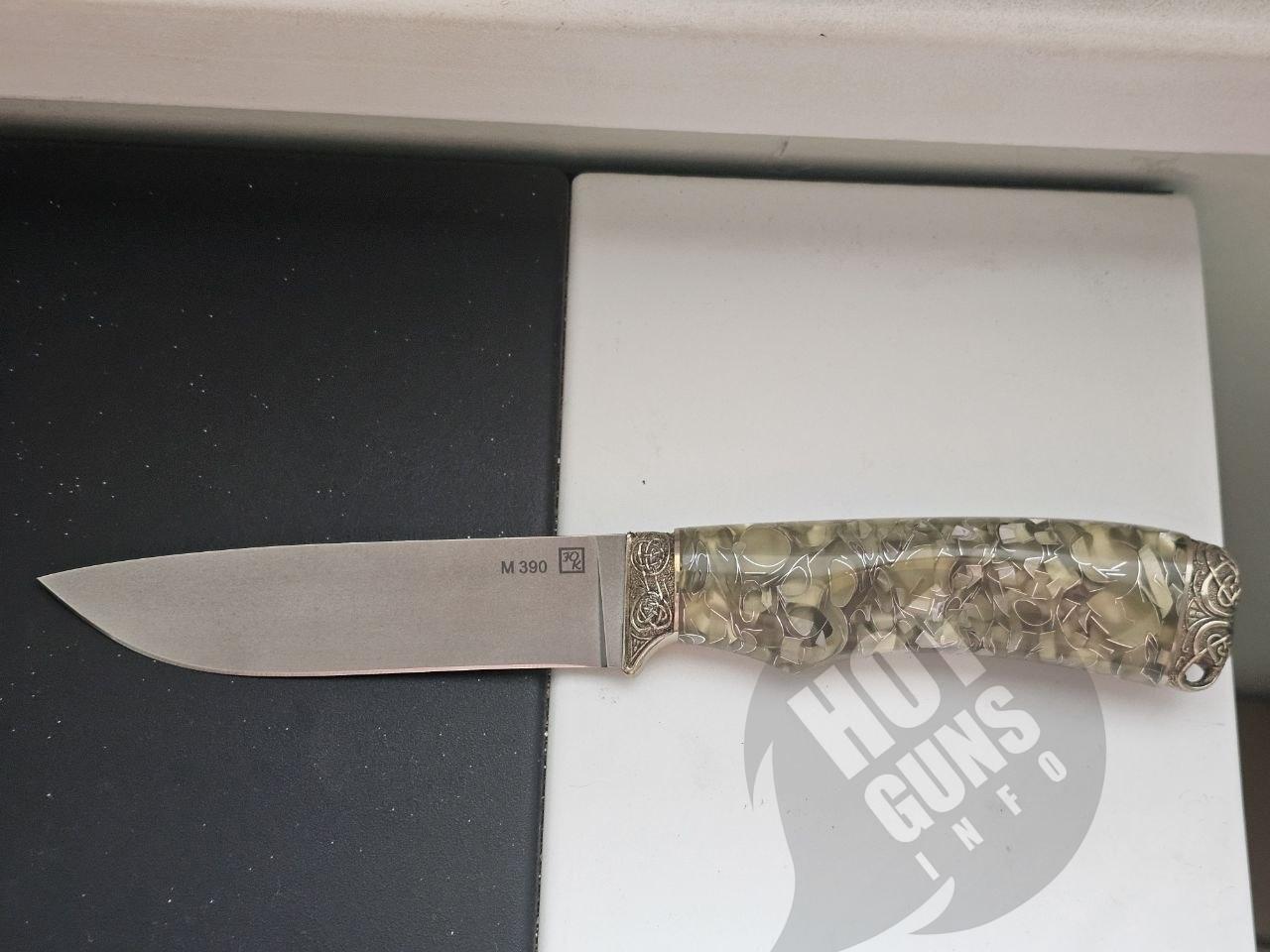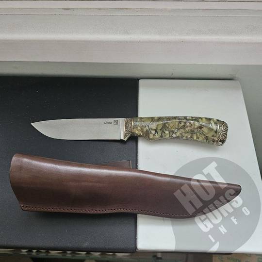 Нож "МАЛАХИТ", выполнен из порошковой нержавеющей стали BOHLER M390 , что придает им высокую твердость и качество заточки. Нож украшены литьем из мельхиора с орнаментом. Рукояти - из кап-акрила.