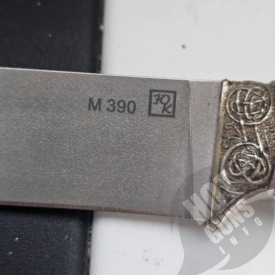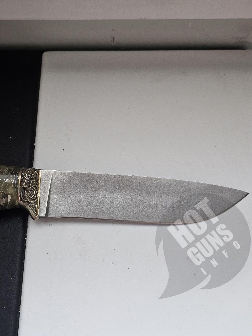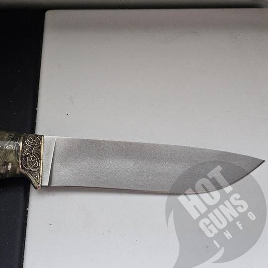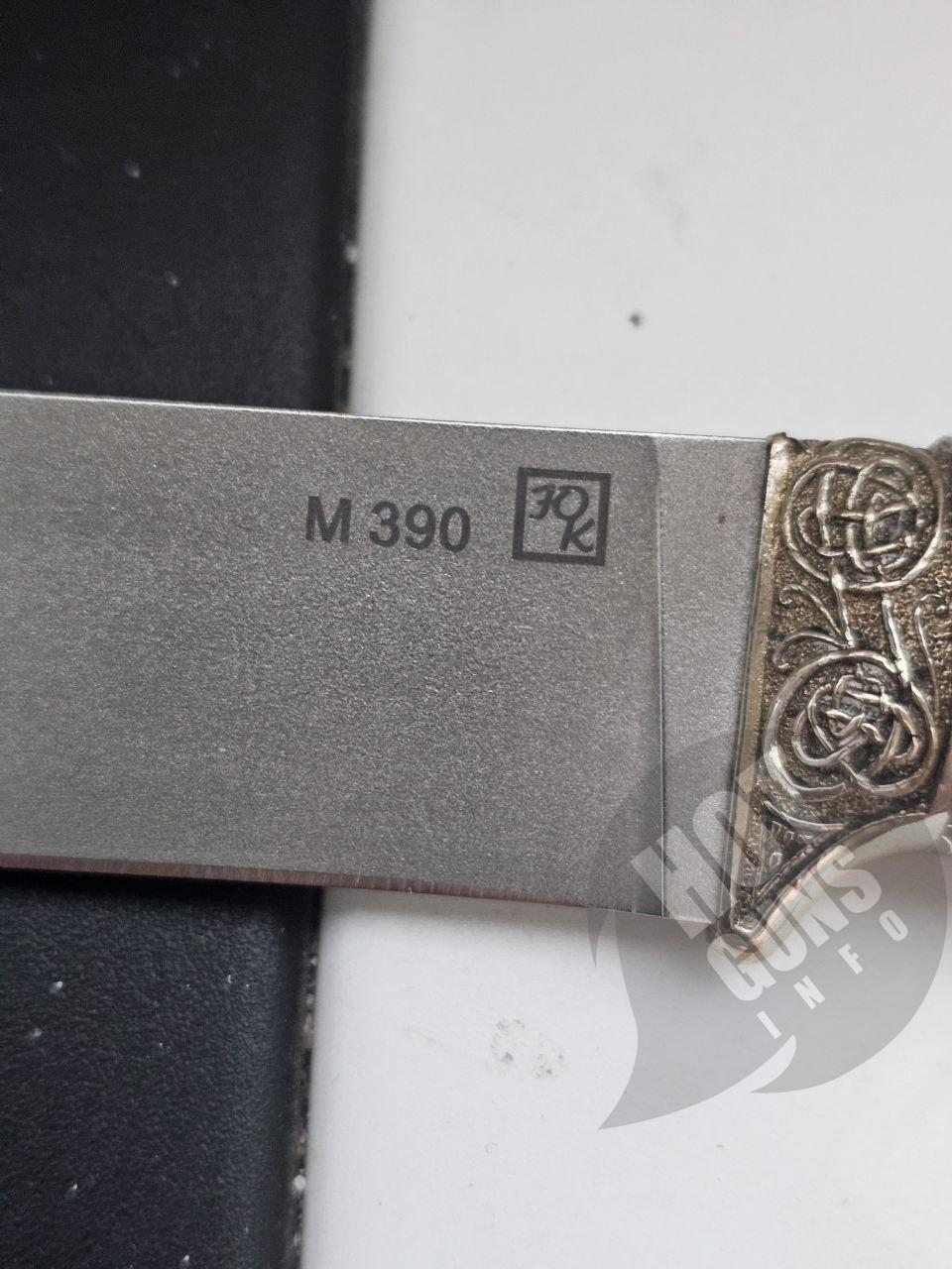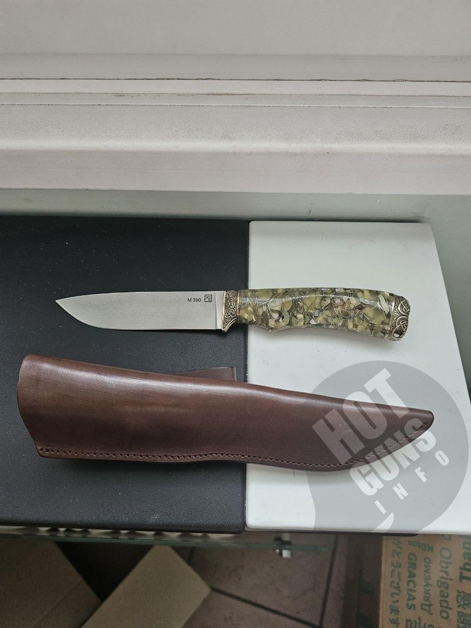 Нож "МАЛАХИТ", выполнен из порошковой нержавеющей стали BOHLER M390 , что придает им высокую твердость и качество заточки. Нож украшены литьем из мельхиора с орнаментом. Рукояти - из кап-акрила.