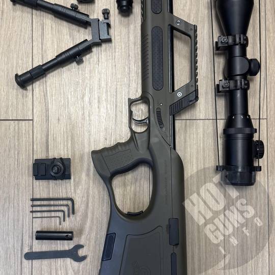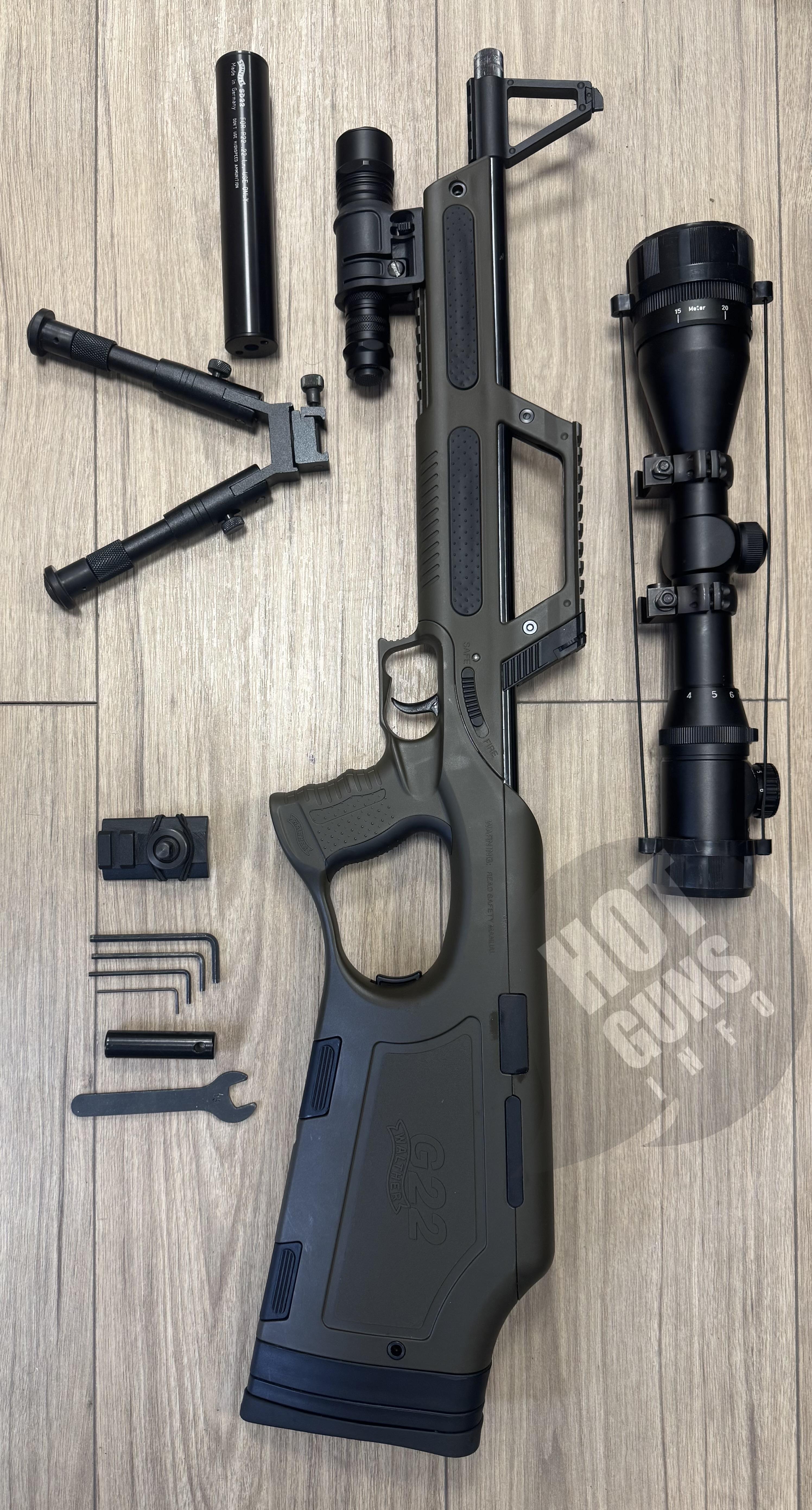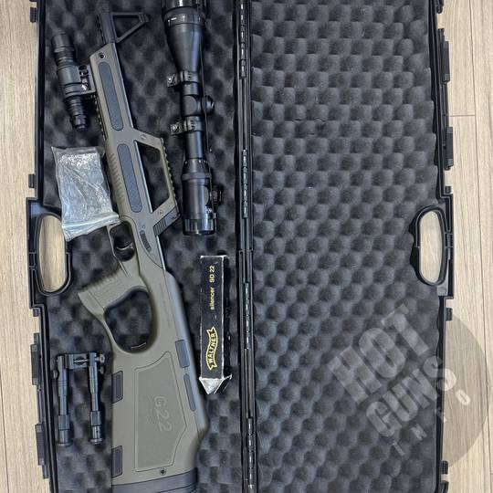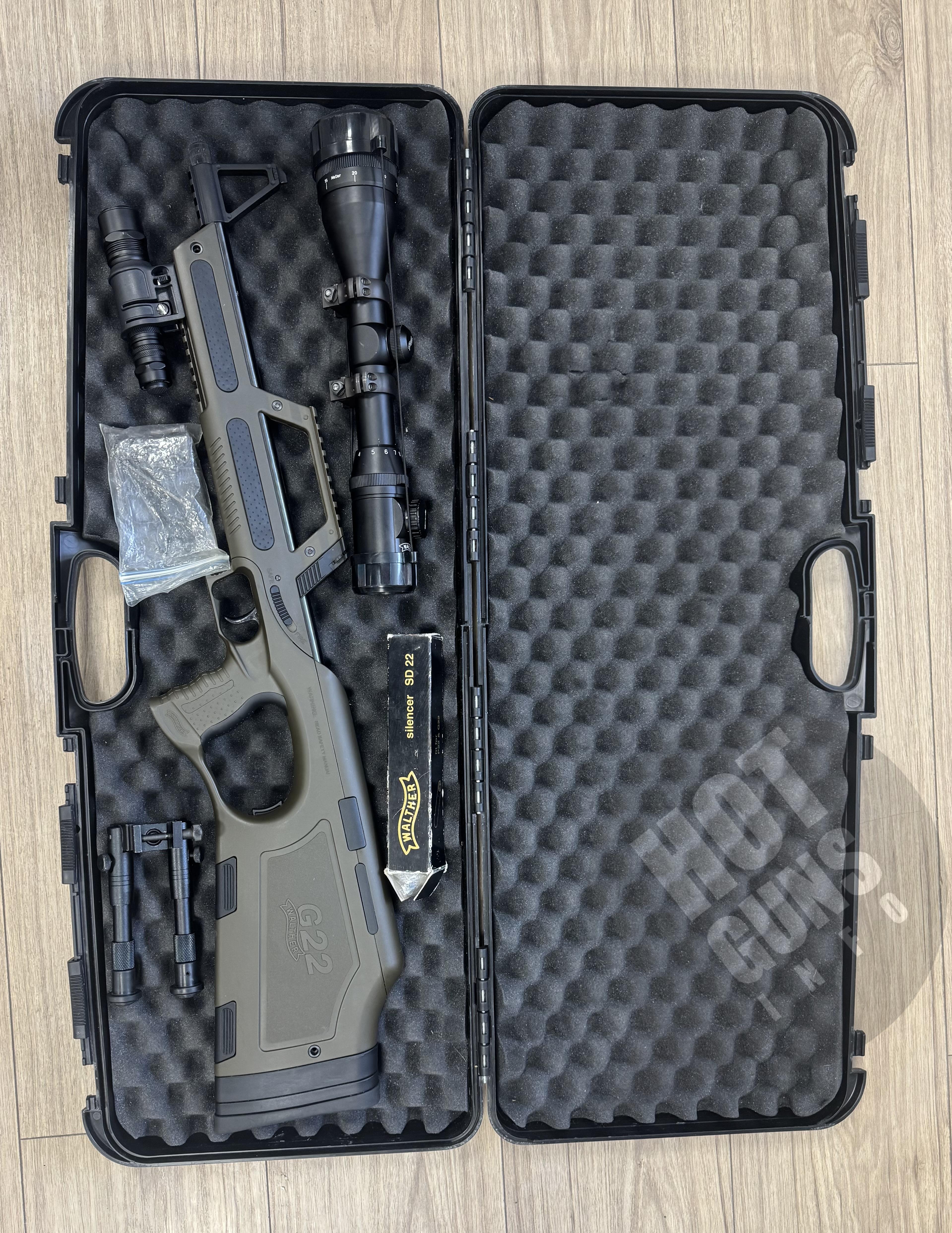 продам гвинтівку Walther G22, зелений пластик, настріл 200-250, оптика, глушник, сошки, ліхтар, кейс (все що на фото)